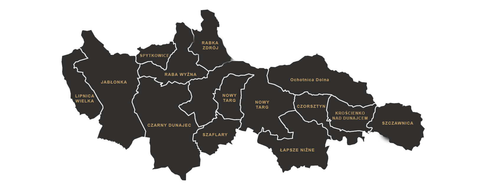 Gmina Nowy Targ: Dębno, Długopole, Dursztyn, Gronków, Harklowa, Klikuszowa, Knurów, Krauszów, Krempachy, Lasek, Ludźmierz, Łopuszna, Morawczyna, Nowa Biała, Obidowa, Ostrowsko, Pyzówka, Rogoźnik, Szlembark, Trute, Waksmund